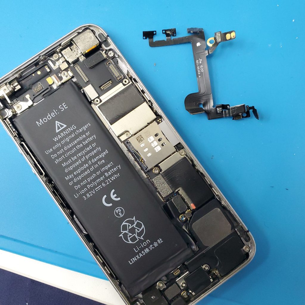 このような故障が発生した場合、iPhone SE スリープ ボタン 交換が必要になります。交換修理は、基盤とバッテリーの取り外しが必要な修理となり、画面を取り外し、基盤の下の電源ボリュームのケーブルを取り外し、壊れているケーブルを交換し、新しいものを取り付けて本体基盤を元に戻す必要があります。